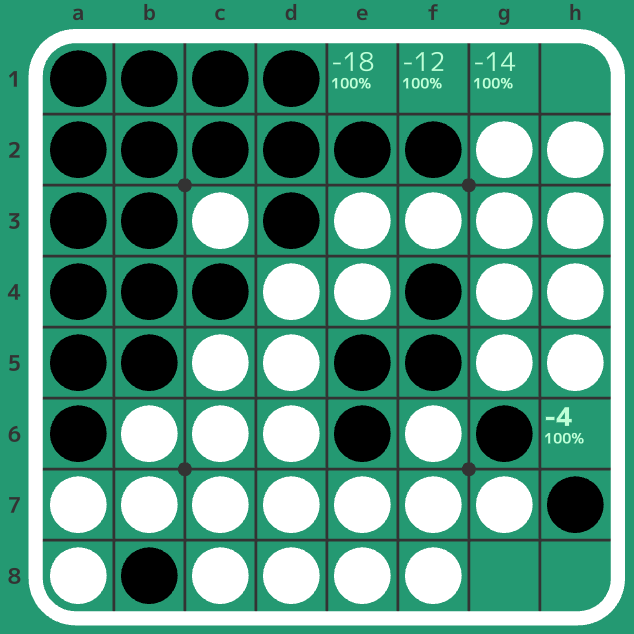 盤面5において、もし相手がF1やE1やG1を打ってしまった場合は黒のH8が強烈です。ブラックラインを白で通したまま盤面を進めることができるため、最終的に黒がH1とG1を連打できる展開になります。ですが相手は強豪のPeipeiさん。間違えてはくれません。的確にH6で対応されてしまいました。